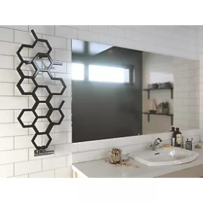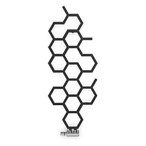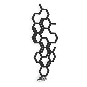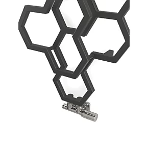 Smooth, matt black designer radiator with hexagonal shapes across a multi-layered design. Features 50mm pipe connections (suggest matching with 50mm integrated valve). Portrait (vertical) model and can not be installed horizontally.