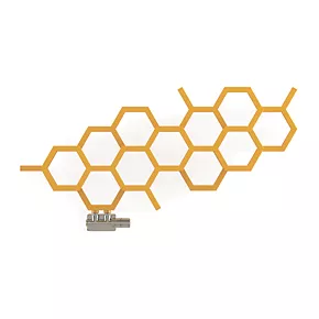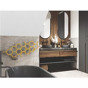 Smooth, mustard designer radiator with hexagonal shapes across a multi-layered design. Features 50mm pipe connections (suggest matching with 50mm integrated valve). Landscape (horizontal) model and can not be installed vertically.