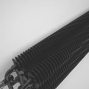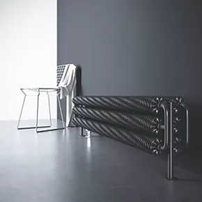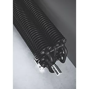 Designer radiator featuring coiled plates around central steel columns in a rounded profile, creating a battery-like appearance. Matt, rough-textured sparkle finish. Features 50mm pipe connections, which can be matched to a 50mm H-block valve to provide a neat finish.