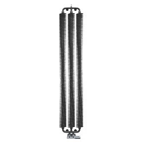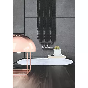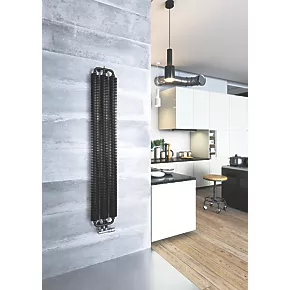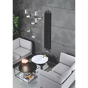 Designer radiator featuring coiled plates around central steel columns in a rounded profile, creating a battery-like appearance. Matt, black finish. Features 50mm pipe connections, which can be matched to a 50mm H-block valve to provide a neat finish.