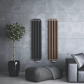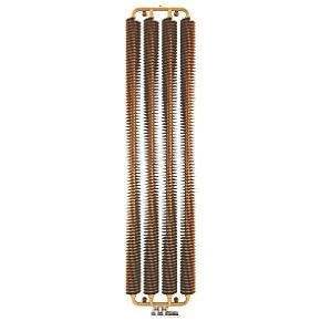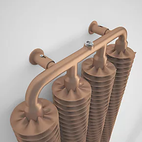Designer radiator featuring coiled plates around central steel columns in a rounded profile, creating a battery-like appearance. Smooth, metallic copper finish. Features 50mm pipe connections, which can be matched to a 50mm H-block valve to provide a neat finish.